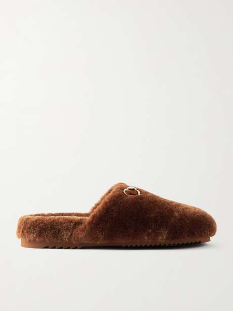 Gucci's slides are so chic and cozy, you'll never want to take them off. Crafted in Italy from fuzzy shearling, they're embellished with gold-tone horsebit hardware and rest on serrated soles that offer plenty of grip.