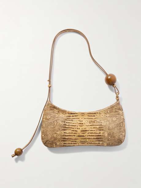 Designed in a sculptural curved shape, Jacquemus' 'Le Bisou Perle' bag is crafted from snake-effect leather. It's embellished with wooden beads at each end of the shoulder strap, lined in hard-wearing canvas and fitted with a discreet internal pocket.