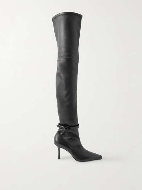 Jimmy Choo’s ‘Camie’ boots bring drama with a sleek, second-skin fit. Made from supple leather in a point-toe shape, they extend over the knee and have a knotted strap around the ankle. The stiletto heels offer 85mm of lift.