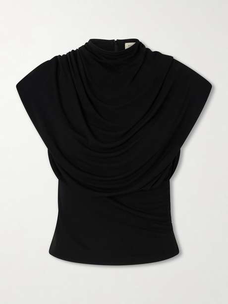 KALLMEYER's 'Jocelyn' top exemplifies masterful structure. Cut from matte jersey, it has a gathered turtleneck that flows into soft cape-effect draping over the sleeves, while the fitted bodice creates a streamlined silhouette. Wear it with tailored pants or a midi skirt for a polished, elevated look.