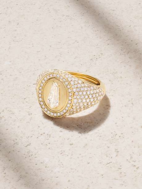 Modeled on classic signet styles, KAMYEN's ring centered with a unique kite-shaped diamond that sparkles all-the-more-so thanks to the scores of pavé stones surrounding it. It's cast from 18-karat gold and has a brushed, matte face.