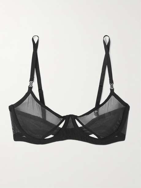 Kiki de Montparnasse's 'Brienne' balconette bra features elegant cutouts that provide a subtle glimpse of skin. It's made from sheer black mesh and has supportive underwire and adjustable straps. Wear yours with the matching thong.
