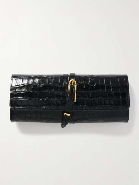Liffner's clutch is defined by a cool belt fastening - it wraps twice around the compact shape, ensuring it stays secure. It's been locally made in Italy in award-winning tanneries from croc-effect leather and offers enough space for your most-used cards, keys, lipstick and mints.