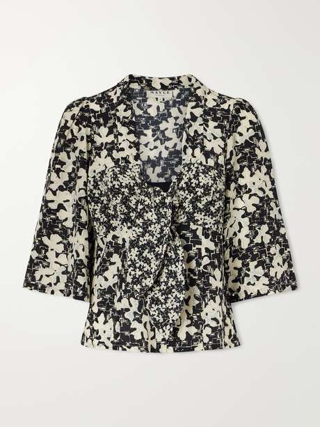 Maison Mayle's 'Kazu' top combines two floral prints for a striking layered effect. Cut from silk, it has a deep V-neckline with a tie fastening and 3/4-length sleeves. It calls for stacked jewelry.