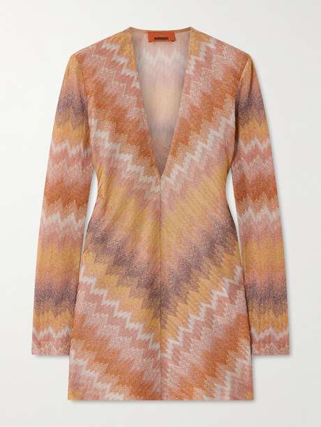 Missoni's dress glistens with metallic threads, making it perfect for flash photography. Made using the label's signature crochet-knit technique, it's patterned with chevron stripes and has a plunging V-neckline.