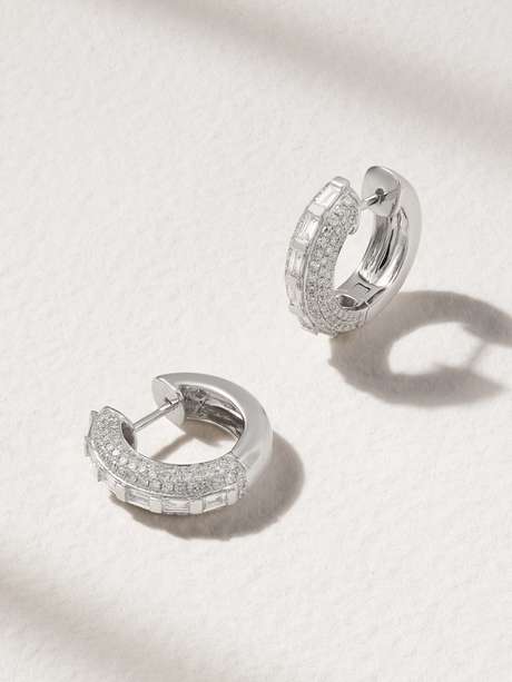 "We’re not just creating jewelry; we’re creating heirlooms, pieces that can be passed down through generations," says Ladan, co-founder of SHAY. Handcrafted from 18-karat white gold, these hoop earrings are inlaid with sparkling pavé and baguette-cut diamonds totaling 1.65 carats. Wear yours day or night.