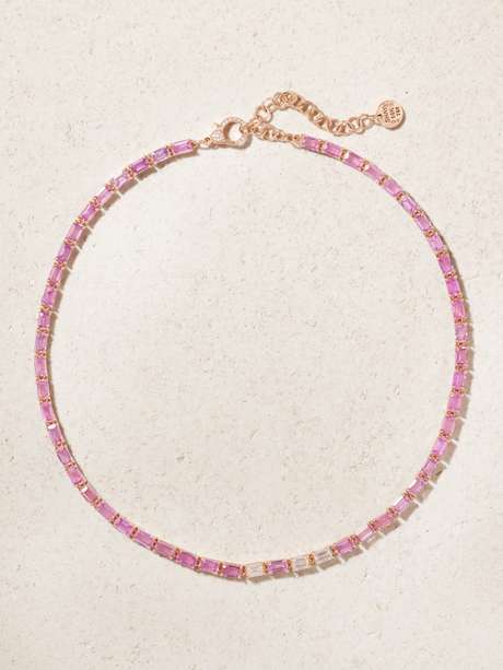 SHAY's necklace puts a colorful spin on classic tennis styles. It's handmade from 18-karat rose gold and set with 20.00-carats of baguette-cut pink sapphires and 2.00-carats of sparkling diamonds.