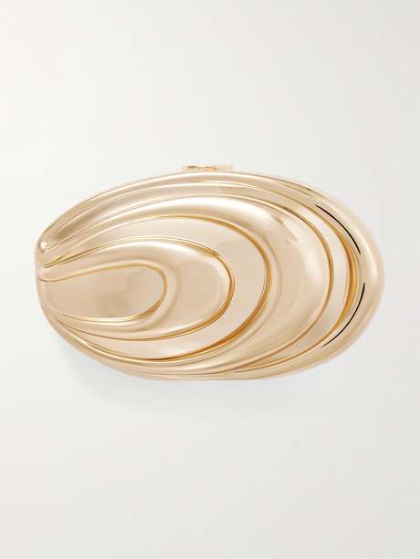 Simkhai's artful 'Inez' clutch is bound to draw the eye. Made from gleaming gold-tone metal, it has a sculptural rippled design with a detachable chain strap to match. Keep your keys, cards and lipstick inside.