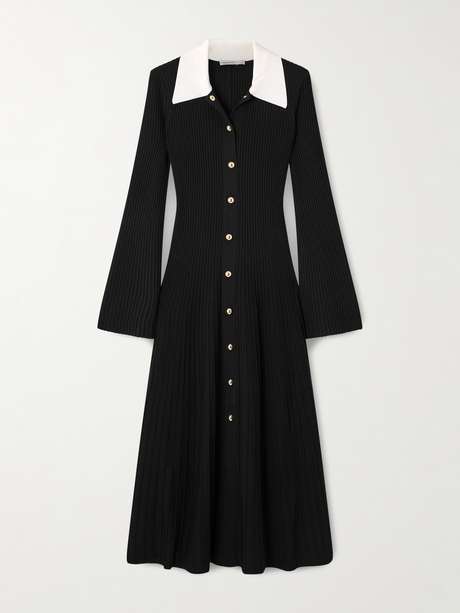 SIMKHAI's 'Philippa' dress is designed with a contrasting collar that brings a preppy edge. It's made from ribbed knit that hugs the bodice and has a floaty hem and flared sleeves. The silver-tone buttons add polish.