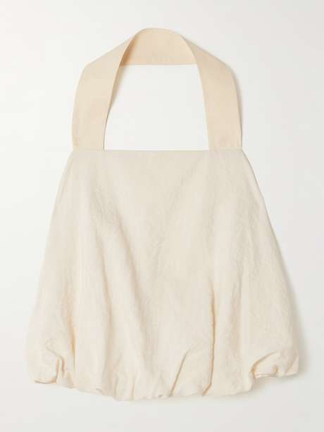 ST. AGNI's 'Cloud' top is named for the puffed, gathered hem. Offset with a cotton-blend strap, it's made from silk-blend that has a subtle, papery texture and is elegantly twisted at the open back.