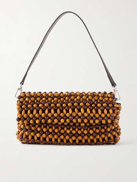 STAUD's 'Timmy' bag showcases artistry through detailed wooden beadwork. Crafted from leather, it has a flap closure with snap buttons and is spacious enough to fit your phone, wallet, and keys.