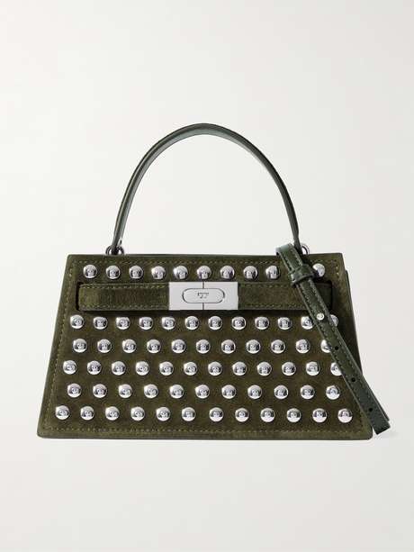This version of Tory Burch's 'Lee Radizwill' tote is embellished with rows of silver-tone studs that you can match your jewelry to. Crafted from suede, it has a compact, structured shape with a belted clasp. There's enough space inside for your phone, cardholder and keys.