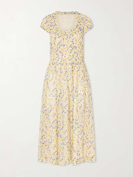 Ulla Johnson’s "Calliope" dress is printed with delicate florals across silk-crepon, enhancing its softly textured surface. The midi silhouette drapes with gentle fluidity, balancing femininity with modern ease.