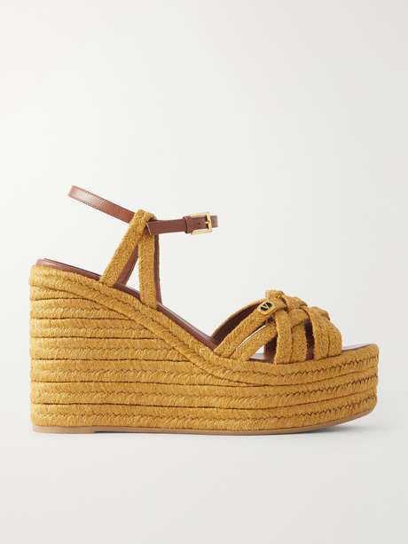 VALENTINO GARAVANI 120 leather-trimmed logo-embellished raffia espadrille wedge sandals