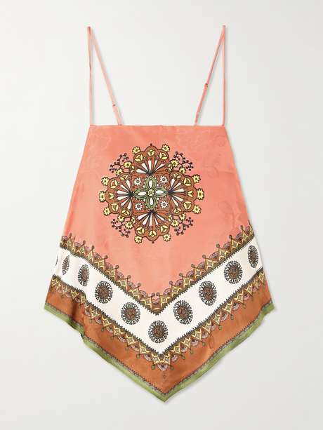 ALÉMAIS' 'Contina' top features a striking print first seen on the Resort '26 runway in Marrakech. Cut from fluid satin-jacquard, it's designed in a scarf-style silhouette that ties at the shirred back. Pair it with the matching pants for an effortless vacation look.