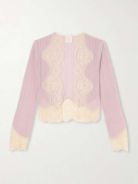 The 'Lingerie Lace Knits' cardigan in blush by Anna Sui is designed as an elegant layering piece. Crafted from a lightweight stretch knit, it drapes softly over the body, while lace trims frame the edges and sleeves, lending a romantic finish. Style it with the coordinating camisole.