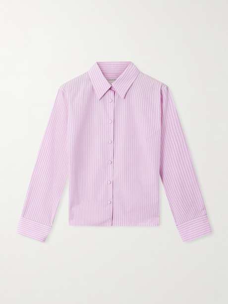 Veronica Leoni's debut for Calvin Klein Collection was a masterclass in timeless tailoring and "monumental minimalism." This 'Daisy' shirt is cut from crisp striped cotton-poplin in a menswear-inspired, boxy shape. Wear yours solo or layered under a tonal sweater, as per the Fall '25 runway.