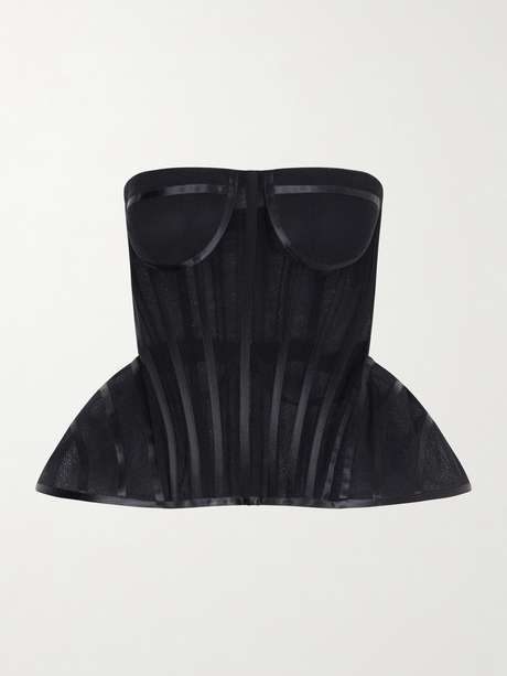 Carolina Herrera's bustier top has an armour-like quality inspired by ancient forms. Crafted from sheer tulle, it has visible boning throughout and an exaggerated curved hem that creates an hourglass silhouette.