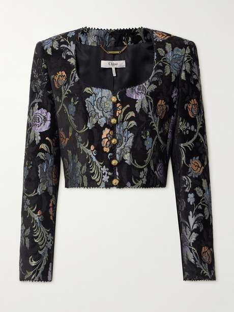 Inspired by ornate tapestries, Chloé's jacket is jacquard-woven with colorful florals. It's cut for a cropped fit and fastens with textured gold-tone buttons. Wear yours with a lace camisole and a layer of charm necklaces.