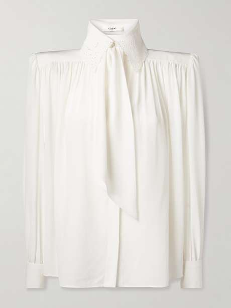 For Chloé’s Fall ’25 collection, Creative Director Chemena Kamali looks to the romanticism of bygone eras and the treasured heirlooms they inspire. Seen on the runway, this shirt is cut from organic silk that's gathered to create a light, fluid shape. Padded shoulders and pussy-bow ties sit beneath a delicate broderie anglaise collar, adding to its vintage charm.