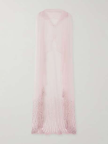 Clio Peppiatt's 'Moonray' cape captures the glamour of Old Hollywood and Art Deco. Cut from sheer tulle, it's delicately scalloped around the shoulders and falls to a flowing maxi length with rows of glistening sequins and beads that mimic rays of light.