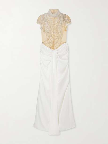 Named in homage to the glamorous icon, Clio Peppiatt's 'Zsa Zsa' gown breathtakingly evokes Old Hollywood. It's made from sheer mesh layered with strings of glistening faux pearls, while the satin skirt gathers and drapes decadently.