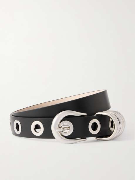 Déhanche's 'Rivet' belt is from the brand's highly coveted 'Hollyhock' collection – note the signature eyelet embellishment. This version is crafted from smooth leather with a silver-tone buckle and a row of rings, instead of a classic loop.