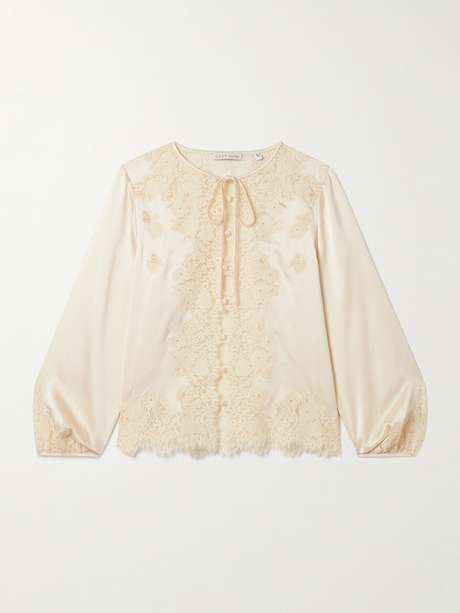 Understated and romantic, DÔEN's 'Lucine' blouse is made from lustrous silk-satin trimmed with tonal lace for a romantic touch. Designed for a slightly loose fit, it has covered buttons and adjustable neck ties, which can be knotted into a pretty bow or left to drape. Style it with everything from flowy skirts to sleek tailoring.