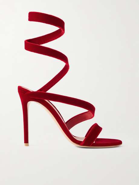 Gianvito Rossi's 'Opera' sandals are a study in sculptural elegance. Made in Italy from rich red velvet, they have dramatic spiral straps that coil up the ankles like ribbons. The stiletto heels measure 105mm.