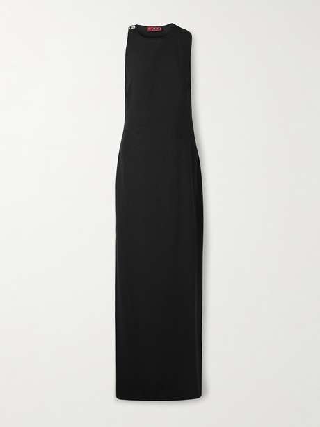 Gucci's gown exudes understated glamour, defined by the crystal-encrusted 'GG' logo at one shoulder. It's cut to drape loosely over your frame from crepe de chine and has a layered back that creates a dramatic leg-baring split.