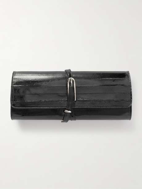 Liffner's clutch is defined by a cool belt fastening - it wraps twice around the compact shape, ensuring it stays secure. It's been locally made in Italy in award-winning tanneries from eel and offers enough space for your most-used cards, keys, lipstick and mints.