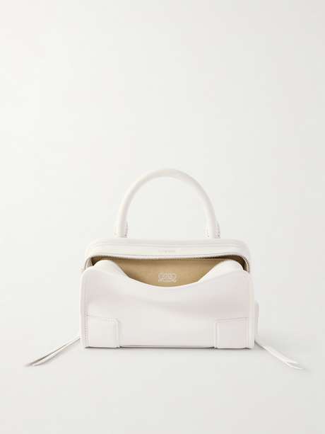 Loewe reinterprets its iconic bag with the new ‘Amazona 180’ version. Crafted in Spain from soft white leather, it has a small rectangular shape with rounded edges and a top handle. Designed to be carried open to reveal the printed ‘Anagram’ logo inside, it includes a secure compartment for essentials and a detachable strap for versatile wear.