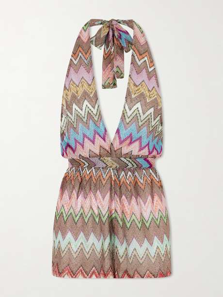Missoni playsuit has been crochet-knitted in Italy and is flecked metallic threads that’ll glisten in the sun and low light. It has an elegant halterneck profile and elasticated waistband.