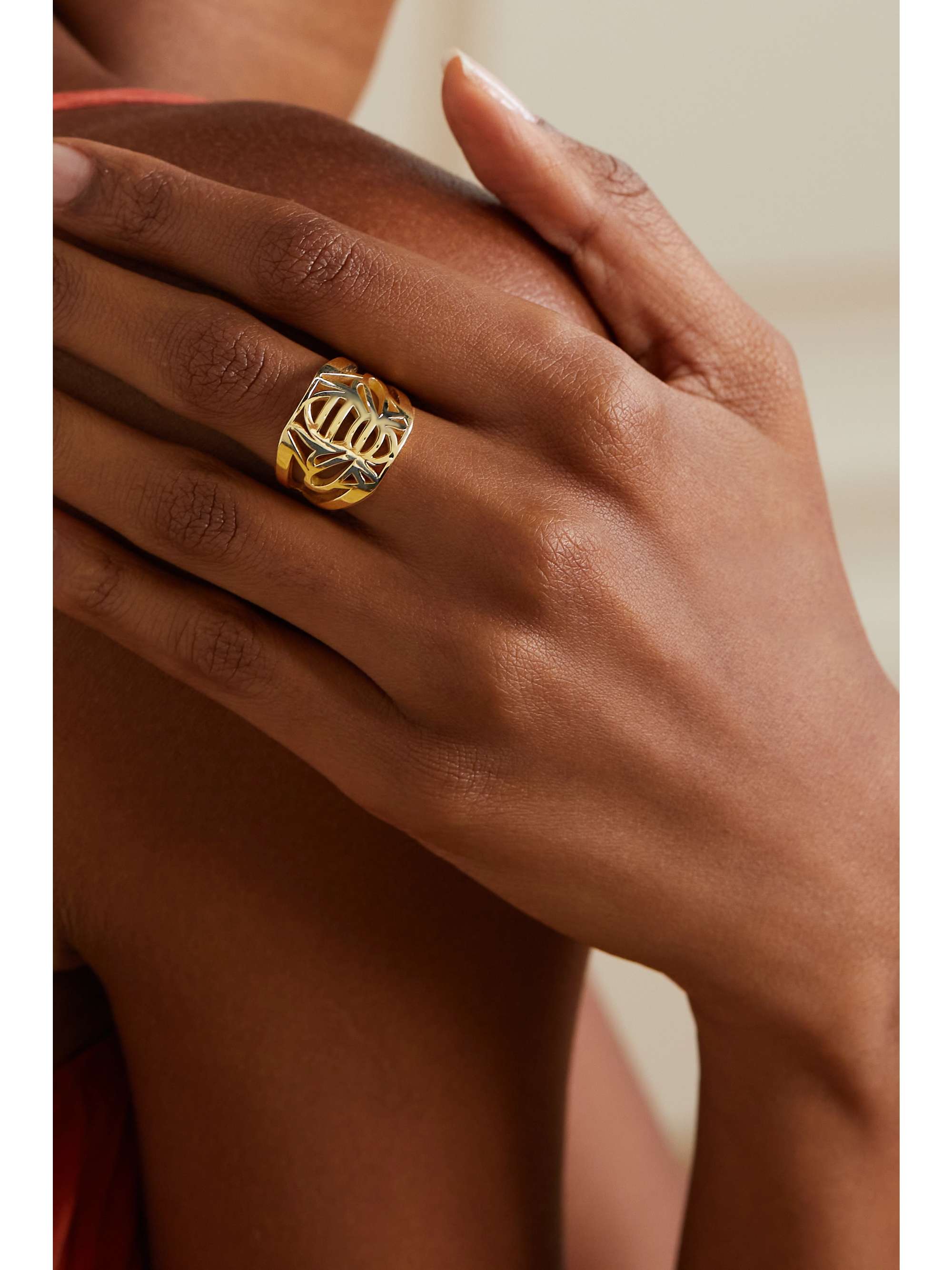 Sabbadini's ring is intricately carved in the shape of the brand's signature 'Bee' motif, which is traditionally seen as a symbol of good fortune. It's been made in Italy from polished 18-karat gold in a wide shape.