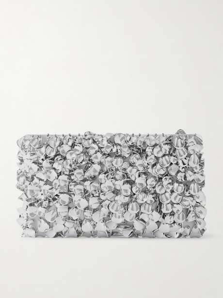 Simkhai's sculptural 'Reese' clutch will elevate even the most minimal of outfits. Made from lustrous satin, it's embellished with scores of hammered silver-tone beads and has a removable chain strap. It's fitted with an internal cardholder and sized to hold your keys, phone and lipstick.