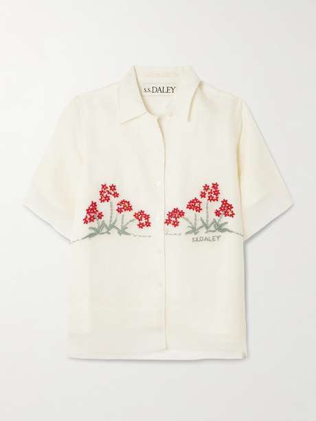 S.S. Daley's designs play irreverently on quintessential British style. This 'Cecilia' shirt is channels vintage styles with its short shape and sweet floral embroidery. It's made from pure silk that's layered over linen for shape and opacity.