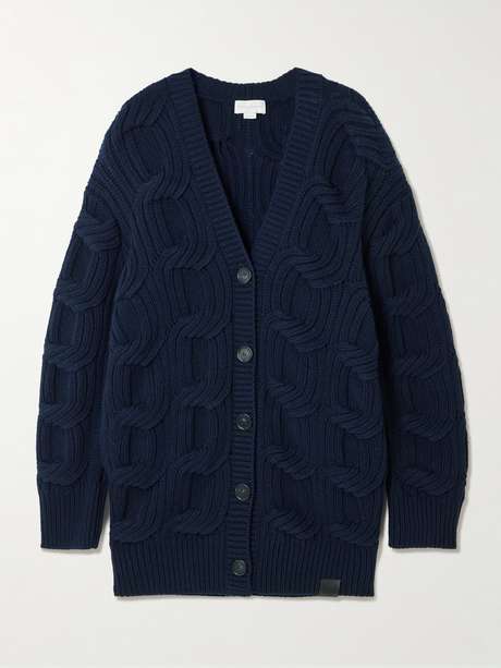Stella McCartney's cardigan is knitted from wool in chunky cable stitches. It has a slouchy shape with a V-neckline and is finished with a logo-perforated patch on the hem.