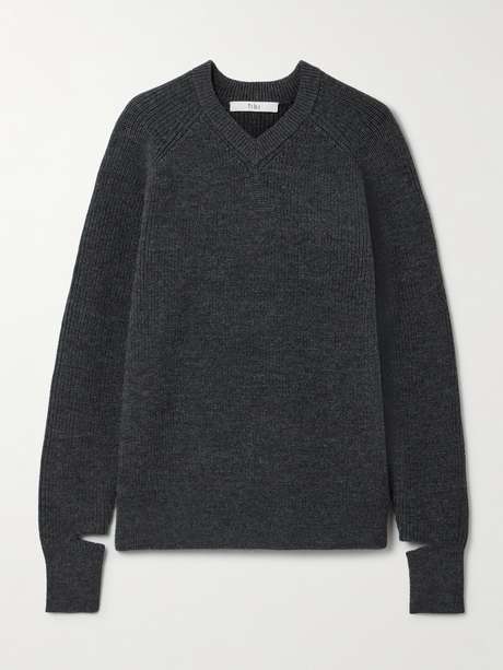 Tibi’s sweater has a minimal, classic silhouette, finished with split cuffs that allow you to slip your thumbs through for a cozy fit. It's made from a ribbed wool-blend and has a loose shape with a V-neckline.