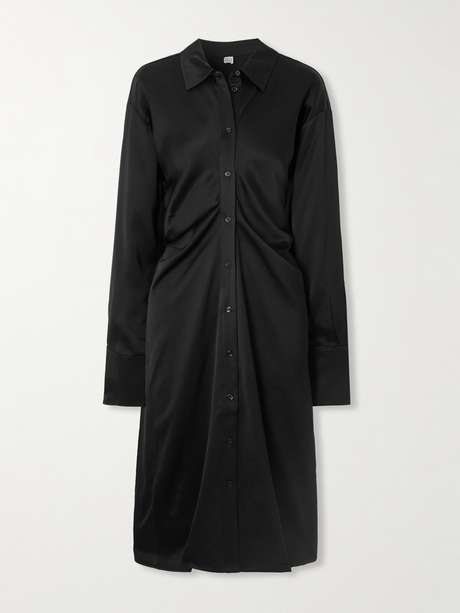 Building on its signature Scandinavian codes, TOTEME’s Fall ’25 collection emphasized ease and fluidity. Shown on the Paris runway, this shirt-inspired dress is cut from satin-crepe with a gathered waist that creates an effortless drape. Pair it with a plush coat and knee boots.