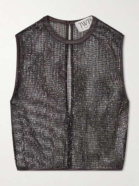 There's something so wearable about TWP's garments that really draws you in. This tank is made from sheer black fishnet that's stitched with tiny sequins, adding a wash of sparkle.