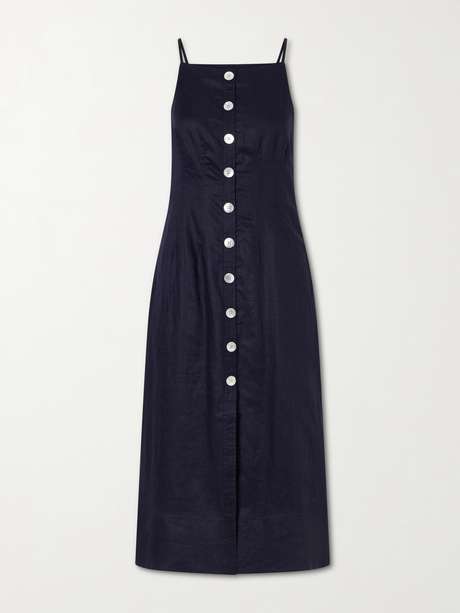 Veronica Beard’s ‘Georges’ dress feels effortlessly refined. Made from airy linen, it’s pleated through the bodice for gentle definition before falling to a fluid skirt. An iridescent button placket and high square neckline lend pared-back structure.