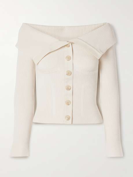 ZIMMERMANN Off-the-shoulder cotton-trimmed ribbed-knit cardigan