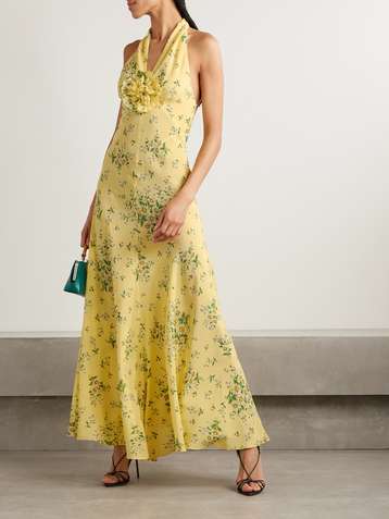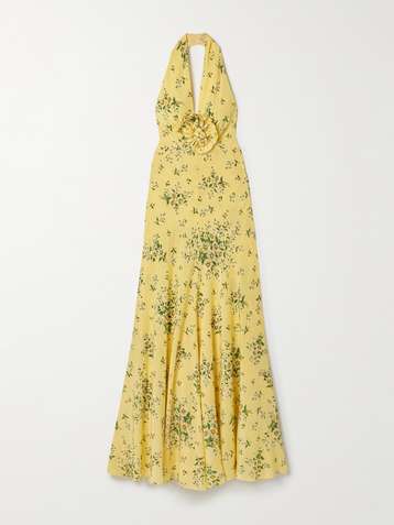 Appliquéd floral-print silk crepe de chine halterneck gown