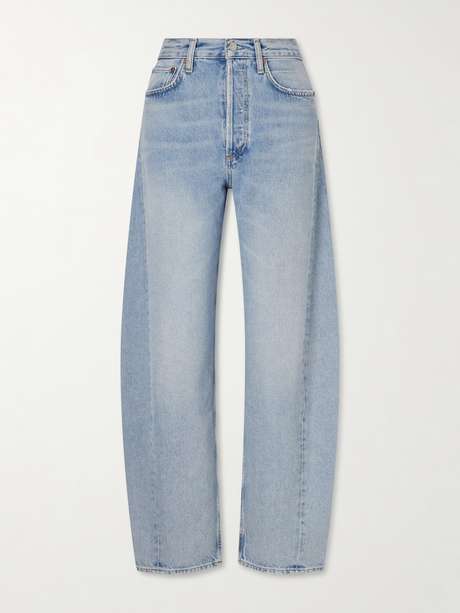 AGOLDE's 'Luna' jeans have a barrel shape that curves through the leg before tapering at the frayed cuffs. They're made from faded light-blue organic denim and have straight seams and a classic five-pocket construction.