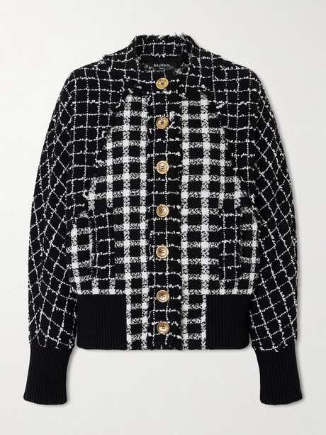Balmain's bomber jacket brings a sense of refinement to what is traditionally more casual. Cut from bouclé-tweed, it's woven with varying checks and fastens with etched gold-tone buttons for an '80s feel.