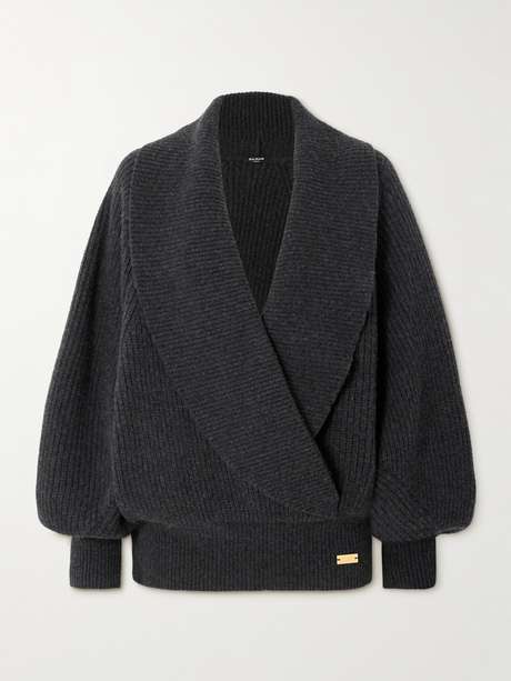Balmain's sweater is an equally cozy and chic choice for cold days. It's made from ribbed wool and has a draped wrap-effect front and oversized batwing sleeves.