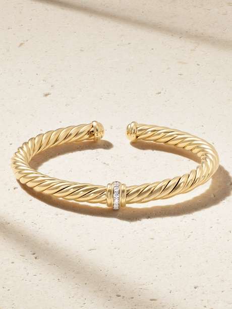 David Yurman's cuff twirls with elegant fluting – a signature of the 'Cablespira Flex' collection. It's crafted from 18-karat gold in an open silhouette and set with diamonds at its raised center.