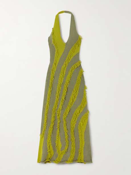 Diotima is one of our buyers' key brands to watch and presents a "nuanced vision of Caribbean style." Made in Jamaica, this 'Roaring' halterneck maxi dress is knitted with looped fringing spilling down each band of lime-green. The zesty hues with look great with bright jewelry.