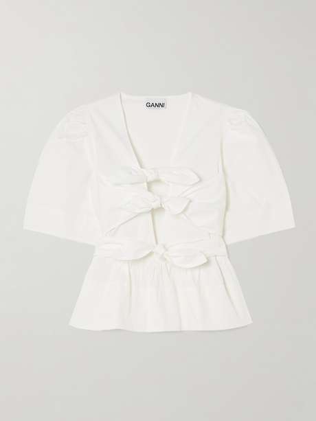 GANNI's blouse captures the Scandi brand's playful and romantic style. It's made from crisp cotton-blend poplin and has puffed sleeves and a peplum hem. A trio of bows temper the plunging V-neckline, creating skin-baring cutouts between them.