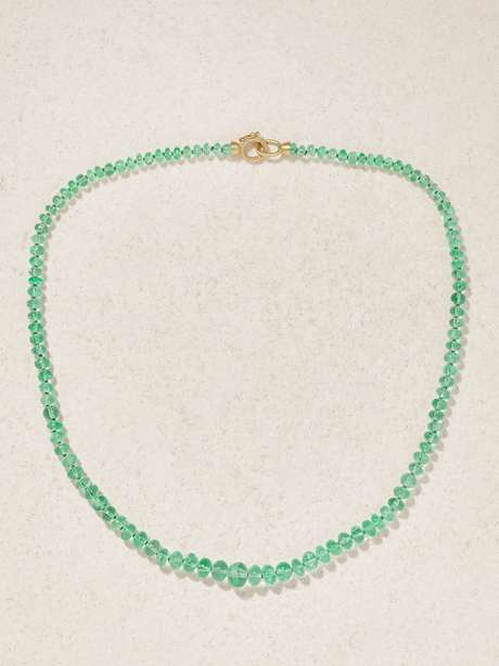 Irene Neuwirth's necklace is playfully designed to resemble beaded candy. It has a hand-knotted silk-cord chain strung with faceted emerald beads (each completely unique) and fastens with an 18-karat gold clasp. Wear it layered with similar styles.